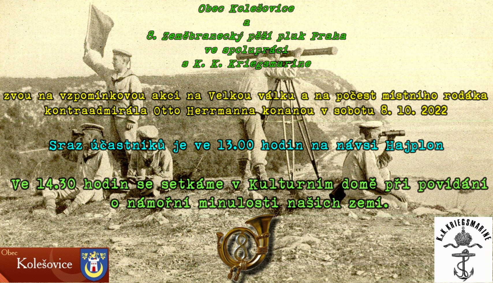 Další ročník vzpomínkové akce na kontraadmirála Otto Herrmanna, který v Kolešovicích má hrob. Po pietní akci bude následovat přednáška o námořní minulosti našich zemí. Sraz účastníků je 8 .10. 2022 v 13.00 hodin na návsi Hajplon